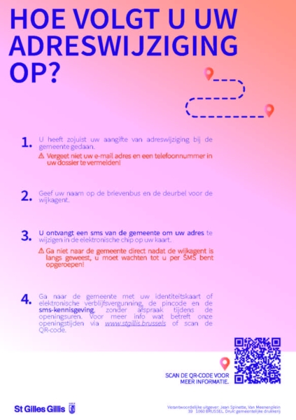 Nadat je je aanvraag voor een adreswijziging hebt ingediend, komt de wijkagent bij jou thuis langs om na te gaan dat je daar daadwerkelijk woont. Hij komt binnen de drie weken bij jou langs. Zodra een positief verblijfplaatsonderzoek wordt ontvangen, word je door SMS uitgenodigd om je nieuwe adres in de chip van je elektronische identiteitskaart of verblijfsvergunning te registreren. Zorg ervoor dat je je PIN- en PUK-code, je indentiteitskaart of je elektronische verblijfsvergunning op zak hebt. Als je die verloren of vergeten bent, moet je er nieuwe bestellen op https://www.ibz.rrn.fgov.be/nl/identiteitsdocumenten/eid/aanvraag-pincode/.